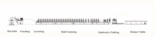 Hydraulic Decoiler -- Feeding -- Leveling -- Roll-forming -- Hydraulic-cutting -- Output table